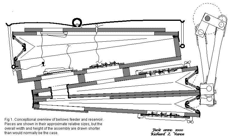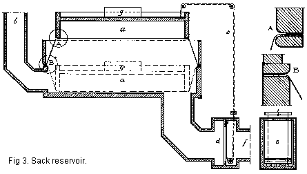 The reservoir is conventionally a single wedge bellows or a double parallel moving bellows (church organs). Another variant is the sack reservoir where the lid is joined to the support frame with a rubber cloth collar that rolls inside and out as the lid moves, fig. 3 [7]. This picture also shows a 'curtain regulator' that shuts off the supply coming in from lower right by way of a chain to the reservoir lid.