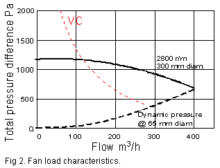 The fan load characteristic above also shows a curve for dynamic pressure. This is found with the Pdyn formula and the linear air speed V as computed from the flow and the fan outlet diameter. When the fan is run free, without anything connected to it (giving 400 m3/h with that specific example fan), then there will be zero static (over)pressure at both ports. Then all work done by the fan is used to develop a dynamic pressure, manifest only in the speed of the output air.