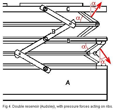 Contrarily, in the upper outward folded bellows between frames B and C, the rib forces change sign. So when you fill a single, weight loaded outward folded reservoir the pressure increases as you fill it. The specific feature of the illustrated double bellows design is to have these opposing actions to neutralize each other. But to make this work you must force frame B to be mid-way between A and C, effected by the pantograph mechanism D. This double bellows then keeps constant pressure, independent of filling degree, when compressed by a weight.