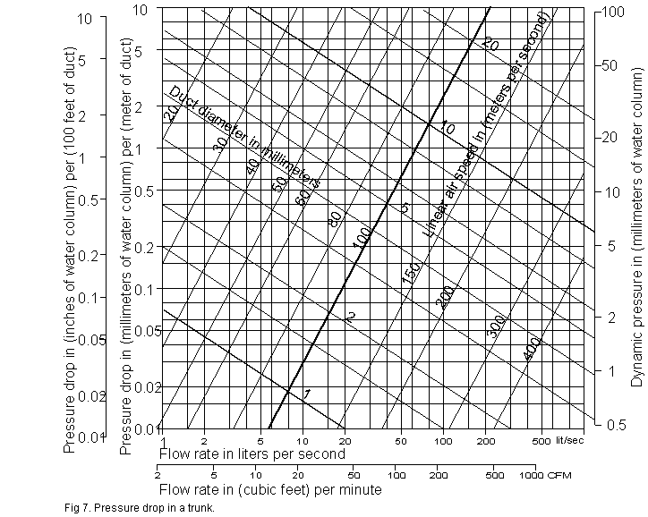 Pvisc is the result from the internal viscosity of air. This is the component generally talked about and it behaves well in the sense that is is directly proportional to the length of the trunk. The drop is larger as flow rate increases or the trunk is narrower. Computation is rather complicated as the flow in most cases is turbulent. The outcome is however well established from theory and practice combined, and fig. 7 is a diagram tailored to flow and pressure ranges typical with organ blowing. Data and format of it is taken from a diagram for ventilation engineers in a standard handbook [4].