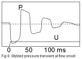 With our 5 meter by 5 cm diameter tube the impedance in SI units is Z = 1.2*343/(p*0.0252) = 2.1*105 Ns/m5. This trunk comes from a remote feeding reservoir with 2500 Pa (25 cmWC, 10 inWC) pressure. Suppose we now suddenly start drawing U=10 liters/second from the tube. By way of the impedance we can then find how much the pressure drops at the tube end: P = ZU = 2.1*105 *0.010 = 2100 Pa. Essentially a short circuit, almost none of the original pressure remains at the receiving end!. What happens next is a wavefront rushes upstream the tube at the speed of sound, sending backwards the required flow. The substance of this flow comes from the decompression of the air in the tube. The wavefront will reach the reservoir after 5/c= 0.015 seconds. Not until now the reservoir 'knows' what happened at the far end of the tube and gets its chance to feed the tube with a flow. But the wave that traveled up the tube hits a low impedance in the reservoir, it is almost totally reflected back toward the loaded end with opposite pressure polarity and the reservoir starts feeding with twice the required flow. After another 15 ms this surge reaches the receiving end, and if we still insist on extracting 10 l/s then pressure will jump up to the reservoir 2500 Pa plus the 2100 Pa surge (minus some because of losses), considerably more than the nominal pressure!