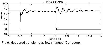 Here are two illustrating examples taken from the real world. Recently Carlsson [2] showed the pressures at the receiving end of the trunk and in the note channel (on the downstream side of the playing valve), recorded from a church organ, fig. 9. This trunk is 13.5 m (44.4 ft) long with a square cross section of 15 cm (6 in) and the transient load change was 8.6 l/s. The initial transient pressure loss is about 20%. This is believed to be representative, it exhibits the same behavior as in example 5, but not to such extreme degree. The pressure oscillates at about 4 Hz, somewhat lower than ideally expected for this length of the trunk. The difference is ascribed to a lowered sound speed and to additional effects from reservoir (wedge) shape, wall elasticity and adjacent channels.