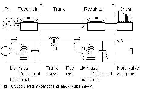 The left basic supply, a feeder and reservoir, is supposed to deliver a constant pressure Pr whatever you load it with. To that end it is normally a complete regulated system in itself, it has basically the same elements and works the same way as the following regulation system. With fan blowers it is common that the first regulating valve (controlled by the reservoir lid) alternatively is put at the fan intake rather than at its outlet. Then follows a trunk, the problem child, leading to the wind chest where pressure is Pc. The trunk causes temporary pressure drops and surges at changes in the load. To close or open the switch in the electrical diagram corresponds to start or stop playing pipes. From the circuit diagram we may describe the middle supply regulator system, between Pr and Pc, to have three branches, there are three different ways for flow to arrive at the note valve switch: