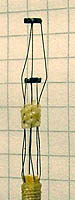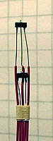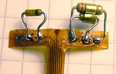 | This circuit remains with the principle of diode forward voltage temperature dependence, but now the hot diode is externally heated by a resistor. This diode was clamped to the heater with a tiny strip of brass sheet and also sealed to it with a drop of cyanoacrylate glue. The photo shows the probe tip cold and heated diodes. They are mounted on a flexible multiple conductor strip, retrieved from a head arm of a junked hard disk drive. The glass encapsulated 1N4448 diodes seem to have a fairly low thermal resistance, the data sheet says 0.24 K/mW including 10 mm leads. | |