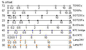 is rather high. These scales differ from the earlier theoretical examples since heating power and U are not directly proportional in the bottom five cases. I find no obvious explanation to why the scale for the NTC bridge comes so very close to an ideal logarithmic. |