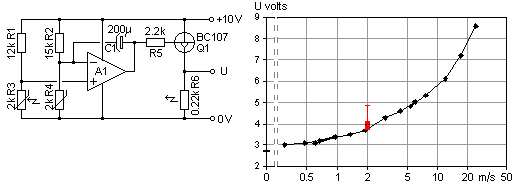 from their known cold resistance and the temperature coefficient. For a direct measurement I used a small oil filled container, carried on a digital thermometer probe. First the anemometer circuit was left to stabilize in still air and its output voltage was recorded. The container was heated with a soldering iron and was then left to cool down slowly while its temperature was tracked by the thermometer. At intervals the probe hot element was dipped into the oil. At the point where the anemometer output then stayed at its earlier recorded value, the oil temperature equals that of the probe tip. The small paper wing in the photo was to shield the cold reference sensor from hot air rising from the oil bath. |