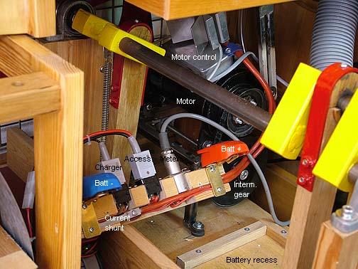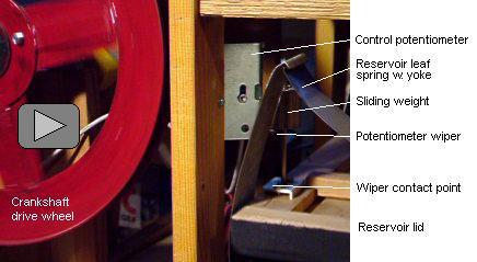 for future rationalization. In the background of this photo you see the feeder drive motor with its control box and its intermediate gear shaft. These are mounted on a cradle, pivoting around rubber washers, one of them seen below the contact bar. The belt connecting the intermediate shaft to the crankshaft is tensioned by a spring, hardly visible below the intermediate gear wheel. |