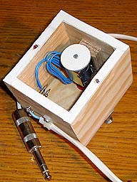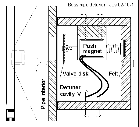 A push magnet (Schroff 12V, 68 Ohms) inside the detuner box can close the hole into the pipe, to make it speak at the sharp note. The reason to use a push magnet is that this will give its maximum force when the valve is closed. This is a definite advantage compared to using a conventional chest magnet which is designed to be held close only by its return spring and the (here non-existent) blowing pressure. The detuner valve has to cope with the oscillating pressure at the middle of the resonator. The amplitude of this is substantial, not much less than the blowing pressure.