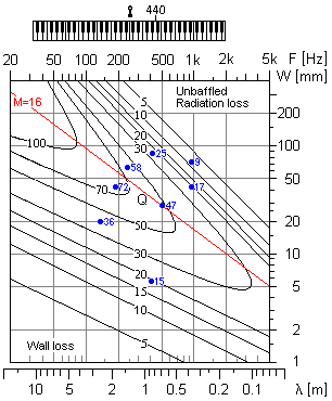 ConclusionsThe loss mechanisms in a pipe resonator were reviewed. The dominating loss with wide pipes is the radiation to the environment, while viscous shear and heat transfer into the pipe wall dominates with narrow pipes. Theoretical results are shown in fig 3 as contours of equal Q in the plane of frequency vs. pipe width. This diagram is equally applicable to open half wavelength pipes as to open-closed quarter wavelength pipes. The theoretical predictions are reasonably verified by a few practical measurements. It is interesting to note that classical Töpfer pipe scaling closely follows a trajectory of maximum Q.References |