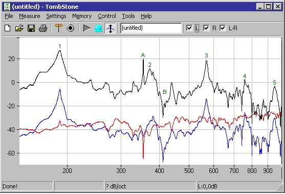 Fig 4. Frequency sweep recording example, showing disturbance from a room. Blue is from the resonator internal microphone, red external reference, and black difference between them. Green figures tell the five lowest resonances. The second resonance peak is rather low because the microphone was located near the middle of the open specimen pipe. A and B denote spurious peaks due to reflections from the floor. |