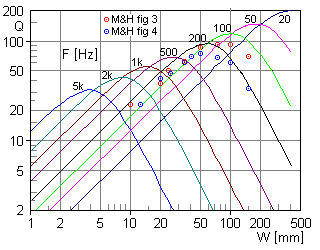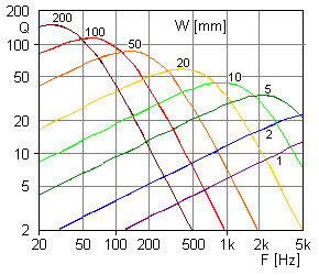 Pipe resonator Q vs. width W and fundamental resonance frequency fUsing the relations above a total Q value was computed as |