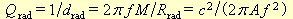 TheoryTo define a resonator Q value, the archetypal way is to use the oscillating energy stored, divided by the energy lost per radian of the oscillation. There are several equivalent ways, for simplicity more common in engineering. One is to divide the resonator reactance by its series connected loss resistance, the way preferred here, or alternatively a parallel loss resistance divided by the reactance. Elementary concepts relating to Q are outlined by Liljencrants (2002). Equivalent to Q we may use the damping factor d = 1/Q. This is motivated when the damping comes from two or more different mechanisms as in the present case of pipe resonators. We will here derive damping factors for the dominating effects, then add them into a total damping, and finally invert this sum into a resulting total Q value.Here we basically discuss in terms of a quarter wave resonator, closed at one end, of length The symbol f , though without a subscript, is not used here as a general frequency variable. Instead it universally denotes the fundamental resonance frequency, thus with a firm coupling to resonator length. Another concept, used in line theory, handles distributed losses in terms of an attenuation constant a = r/2Z + 2Z/g , where Z is the line impedance, r the series and g the shunt resistances per unit length. Because the L - f coupling defines a length this can be rephrased into a damping factor d = c a / (4 f ). As a first step we settle the resonator reactance, its acoustical mass times angular frequency. With cross section area and radius where |