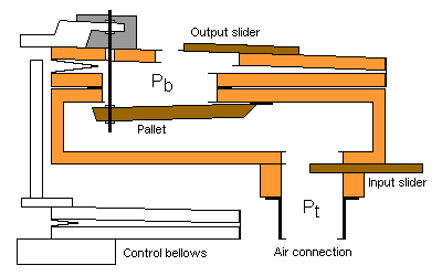 | The flow rate and the aperture of the output slider define an internal pressure Pb gradually building up. When this pressure is large enough the bellows is inflated again, driving the pallet to close eventually. When this happens there will be a temporary peak in the input pressure Pt by the 'hydraulic hammer' effect from the flowing air column in the trunk being abruptly stopped as the pallet slams shut. This pressure peak is higher than the supply pressure to the organ. After some time this pressure pulse will die out and we are ready for another cycle where the bellows can collapse again from its own weight |