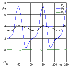 made. The pressure Pc at the feeding end of the trunk oscillates reasonably around the about 3.6 kPa (14inWC) supply. Not much can be said about the magnitude of the variations since nothing is known of the feeding impedance. The Pt trace at the input of the trem, at the opposite end of the trunk, shows very large variations, from very low up to about twice the supply. This demonstrates the 'hydraulic hammer' effect and suggests that the trunk has a profound effect on the trem function. The pressure difference across the pallet varies very much. As a contrast Pb inside the trem bellows is always very low, maybe to a surprise, nowhere near the organ operating pressure. With its fairly large lid area, little pressure is needed to raise its weight. |