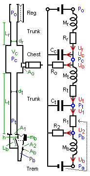 Simulation programThe attached Windows PC simulation program (tremsim.exe) was written in Borland Delphi Pascal. It presents a screen with numerous scrollbars at the left side, where you can input physical dimensions. With radio buttons you can select whether to see these inputs in SI units or in traditional US, but computations and result reports are done in SI throughout. In the middle of the screen fig. 4 is reproduced as an orientation aid. It is supplemented with resulting values of those impedance elements that are constant, essentially the masses and compliances. The resistance elements vary nonlinearly with flows throughout the simulation time span, which is 1.5 seconds. The nonlinearity in itself could make simulation next to impossible, but this problem is circumvented by a simple minded approximation explained below. At top is an image area to show results as graphs vs. time for the various pressures and flows. Here the zero line and scale can be adjusted with scrollbars. Check boxes at right are used to select which data to display.Disclaimer: The results of this simulation are believed to be reasonably accurate in quantity, but cannot be guaranteed. In assessing element values for the simulation, the formulas used are in their most basic form, taken from the classical literature, like eqs. (3) and (6) - (8) below. More refined side effects are not accounted for, e.g. like end corrections or bends in a trunk. The discrete time simulation method in itself is approximate, and finally there is some risk from mistakes by the author. The reader is encouraged to run the program, to modify input dimension parameters at will, and to look at the various result graphs to familiarize with the trem operations. |